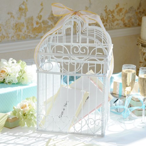 Give your guests a fun spot to place their wedding well wishes with this splendid Birdcage Card Holder. With its sturdy frame and elegant scrolled heart design, it will be the perfect touch to any wedding gift table The white metal frame is designed to contain cards and monetary gifts offers. Top lifts off for easy card removal. Details: Size: Measures 10" by 8" by 16 1 2 inches tall. Materials: Sculpted white metal ... This unique & elegant item is part of our exclusive Wedding Favor and Bridal - Baby Shower collection. They make for a great and unique gift for your wedding reception, bridal shower, bay shower or any other special event.
