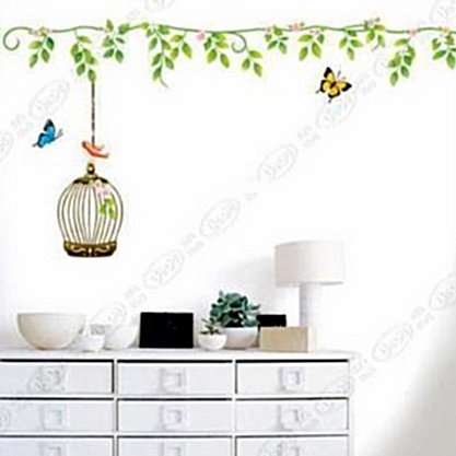 Wall Decor Removable Decal Sticker - Flying Butterflies with Birdcage Under the Green Vine Feature