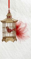 Add a touch of the Orient to your Christmas tree with this pagoda shaped golden birdcage, housing a red bird with a feather tail